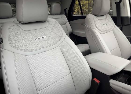 Representing the highest level of luxury in the Explorer, the Platinum ($53,250) upgrades with leather trim, heated and ventilated multicontour front seats, heated rear seats, second-row captain’s chairs, a twin-panel sunroof, a wireless charging pad, and a 980-watt B&O audio system with 14 speakers. The Explorer Platinum exterior is distinct with its satin aluminum exterior trim, adaptive headlights, stylish grille, and 20-inch Luster Nickel-painted aluminum wheels.