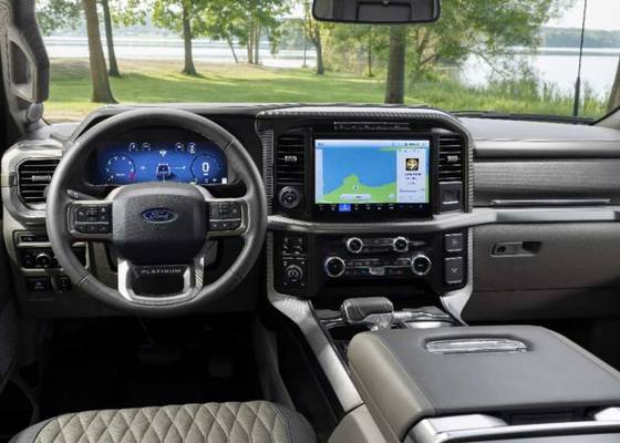 The Western-themed King Ranch is priced from $76,700 and features a cabin decked out with rich leather trim and wood accents. Multi-contour front seats feature the King Ranch badge, and the rear seats are heated. The premium 14-speaker Bang & Olufsen Unleashed Sound System is standard, as is the head-up display, bed utility package, and tow/haul package. Additional standard equipment includes a 3.5-liter EcoBoost V6, a special hood with inserts, two-tone paint with dark bronze lower accent color, distinctive 20-inch wheels, and power-deployable running boards. The King Ranch also comes with one year of BlueCruise.
