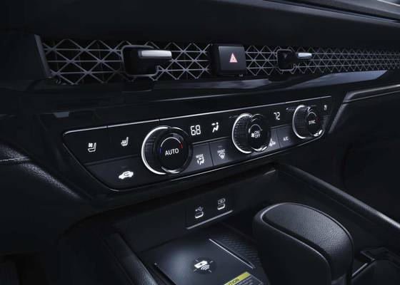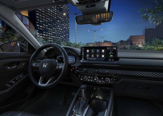 The 2025 Accord shares its interior styling cues with a number of modern and refined Honda models like the CR-V and Civic. The dashboard features a horizontal layout with a distinctive mesh grille that hides the air vents. In the two entry-level trims, the dash is topped by a small 7-inch touchscreen, but other models upgrade to a 12.3-inch screen. Materials quality is good for the class, with padded surfaces in commonly touched areas. The fairly simple layout places controls logically for easy operation.