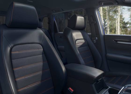 The Honda CR-V's interior is one of our favorites in the compact SUV class. Its uncluttered, expansive horizontal dash features a honeycomb mesh inlay that hides the heat and A/C vents. The CR-V is also very comfortable; its supportive front seats feel great on long drives. The CR-V has more rear-seat legroom than most rivals, and its back seat reclines. Three passengers fit in back without awkwardly knocking knees. Outward visibility is excellent, build quality is top-notch, and there's plenty of interior storage. The door pockets are big, and the CR-V has the largest center console bin in its class.
