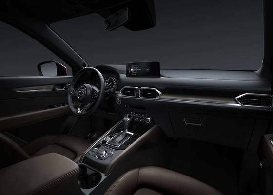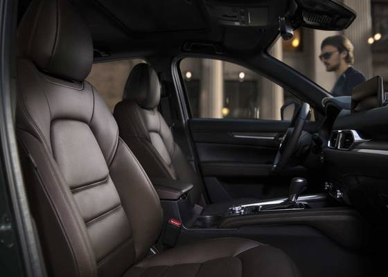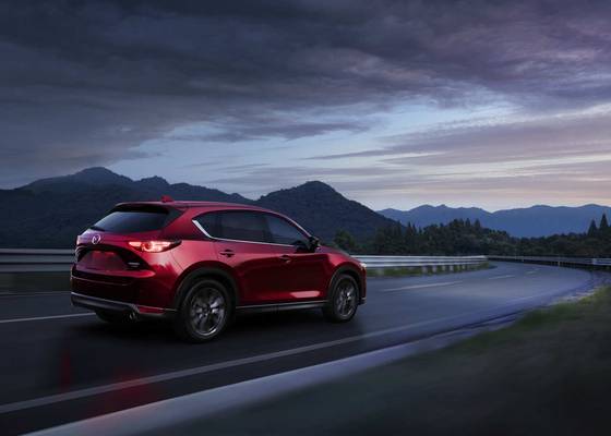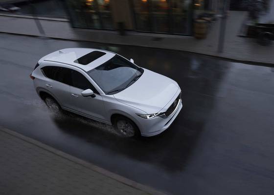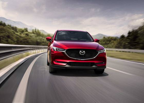 The CX-5's standard i-Activsense safety features include radar cruise control, automatic braking assist with pedestrian detection, lane-departure warning with lane-keeping assist, and blind-spot monitoring with rear cross-traffic alert.