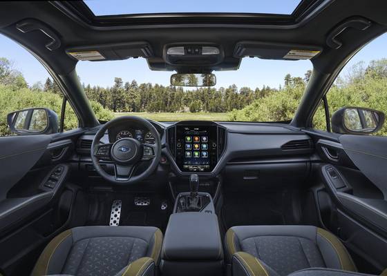 The Premium at $28,365 adds the more powerful 2.5-liter engine, a single 11.6-inch infotainment touchscreen, eight-speed manual mode with paddle shifters, dual-function X-Mode, premium cloth seating surfaces, and roof rails. Options include a power moonroof, blind-spot detection with lane-change assist, rear cross-traffic alert, automatic emergency steering, a 10-way power-adjustable driver's seat, and an all-weather package with heated front seats.