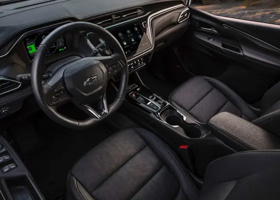 In 1LT form, the interior is a bit basic but still attractive. The 2LT trim gets rich leather seats with an emphasis on front-seat comfort. The backseat accommodates three passengers, but it's a tight fit. The gear selector, mounted on the console, uses push buttons and pull toggles. Despite its small size, the Bolt EV has a roomy interior. The driver and front-seat passenger will have no problems with head-, hip-, or legroom. It accommodates 17 cubic feet of cargo space behind the rear seats and 57 cubic feet with the seats folded down.