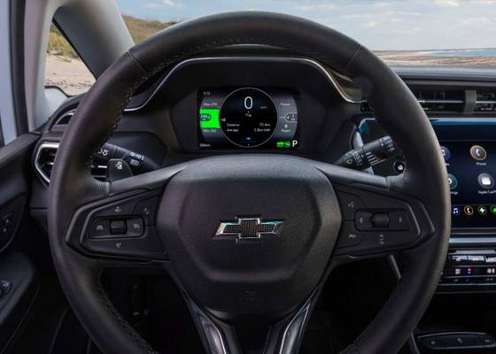 The 2023 Chevy Bolt EV's digital instrument panel is large, colorful, and easy to use. It's also configurable, so it can display key vehicle information, including EV efficiency if you choose. The standard steering wheel includes an array of handy controls on the right and left spokes. And a sport-oriented flat-button steering wheel is an option. One-pedal driving is engaged with the push of a button.