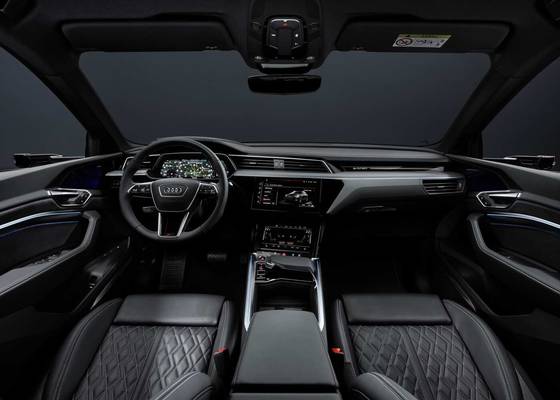 The SQ8 e-tron cabin is fitted with beautiful textured carbon accents, rich-looking (and comfortable) quilted Valcona leather sport seats, and a sport steering wheel.