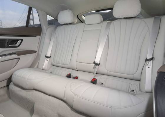 Buyers popping for six-figure luxury cars expect top materials and craftsmanship. The Mercedes-Benz EQS delivers, but again, it’s a notch down from the gas-powered Mercedes-Benz S-Class. There's roominess, both in real measurements and in an open, expansive feel, courtesy of a cab-forward design and nearly flat floor. This is especially true compared to the aging Tesla Model S. By comparison, the back seat in the four-door sports-car-like Porsche Taycan feels cramped. Only the Lucid Air offers the generous rear-seat roominess delivered in the EQS. However, despite the space in back, our test model had the standard seat instead of the rear seat package plus option. And we found the rear backrest angle to be a little steep for long-range comfort.