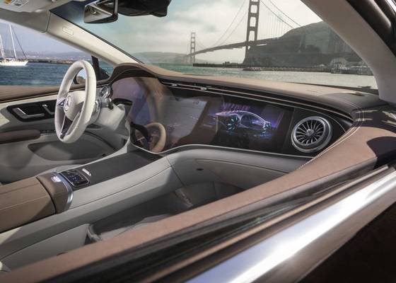 The 17.7-inch center display of the EQS 580's Hyperscreen includes infotainment, climate control, and other functions. The system uses AI to display the most frequently used and most important system functions at the lower part of the screen rather than stacking them in menus.